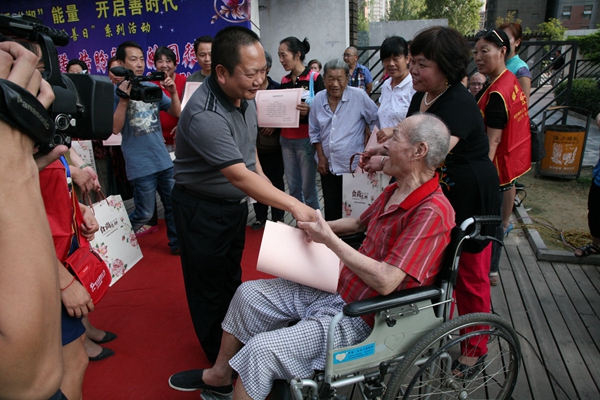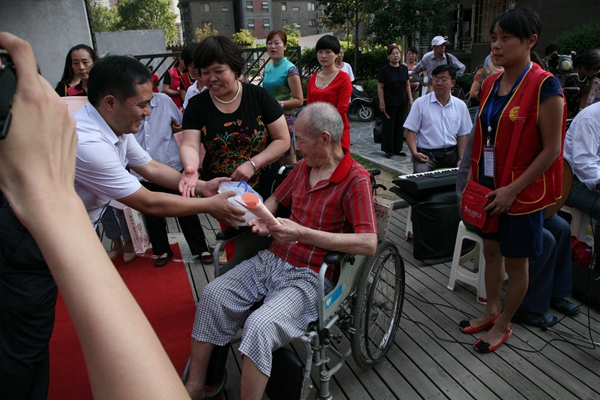 活動隨著一曲歡快的盤鼓開場,河南愛馨養(yǎng)老集項(xiàng)目辦代表王磊發(fā)表了中秋祝詞;兩名來自社區(qū)的老年書法愛好者現(xiàn)場揮毫,寫下了2014鄭州慈善日主題及中秋寄語,鄭州慈善總會副秘書長周培功為他們贈送中秋月餅;一曲文藝節(jié)目后,多家社區(qū)慈善志愿者工作站共同簽約“社區(qū)親情承諾書”,承諾工作站將不遺余力的對老人的提供關(guān)懷與幫助;來自社區(qū)的十名老人代表與其子女共同簽約“家庭親情承諾書”,承諾例如帶老人體檢、拍攝全家福等看似簡單卻充滿溫馨的天倫之樂。承諾書中表達(dá)的雖然是小事,卻是子女對父母老年生活的愛與關(guān)注;簽約后,總會為老人送上了中秋月餅,鄭州市第二人民醫(yī)院還為他們贈送家庭常備的“愛心”小藥箱以表關(guān)懷。活動最后,市二院的義診醫(yī)療團(tuán)隊(duì)講解了專業(yè)的醫(yī)療知識并由社區(qū)呈現(xiàn)上精彩的文藝演出,與居民共迎中秋。